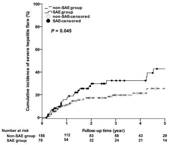 As shown in Figure 2, the 5-year cumulative incidences of severe CR in the SAE group were significantly higher than those in the non-SAE group. The 1-year, 3-year, and 5-year cumulative incidences of severe CR in the SAE and non-SAE groups were 15.69% (95% CI: 7.13–24.25%) vs. 11.17% (95% CI: 5.99–16.35%); 32.45% (95% CI: 20.22–44.68%) vs. 19.63% (95% CI: 12.52–26.75%); 42.78% (95% CI: 27.84–57.73%) vs. 25.42% (95% CI: 16.26–34.58%), respectively (p = 0.045). In addition, as shown in Figure 3, the 5-year cumulative incidences of SAE recurrence in the SAE group were significantly higher than those in the non-SAE group. The 1-year, 3-year, and 5-year cumulative incidences of SAE recurrence in the SAE and non-SAE groups were 8.83% (95% CI: 2.04–15.62%) vs. 0% (95% CI: 0–0%); 17.42% (95% CI: 6.24–28.60%) vs. 1.04% (95% CI: 0–3.07%); 25.91% (95% CI: 10.91–40.91%) vs. 1.04% (95% CI: 0–3.07%), respectively (p < 0.001). However, only one patient died of hepatic failure in each study group.