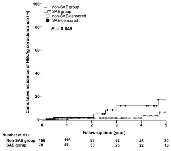 As shown in Figure 4, the 5-year cumulative incidences of HBsAg seroclearance in the SAE group were significantly higher than those in the non-SAE group. The 1-year, 3-year, and 5-year cumulative incidences of HBsAg seroclearance in the SAE and non-SAE groups were 1.45% (95% CI: 0–4.27%) vs. 0% (95% CI: 0–0%); 7.94% (95% CI: 0–17.04%) vs. 0.88% (95% CI: 0–2.61%); 16.82% (95% CI: 2.34–31.30%) vs. 6.02% (95% CI: 0–13.23%), respectively (p = 0.049).