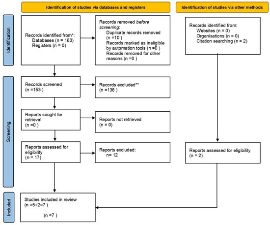 After excluding 10 duplicates, the remaining 153 were examined. Of these, 136 were excluded when reading the title and abstract, since they did not meet the inclusion criteria. The remaining 17 were examined by full-text screening, and five were found to be eligible for our review.