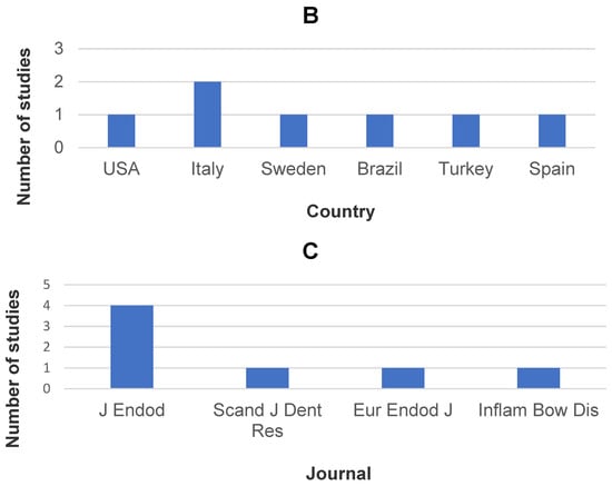 Regarding the prevalence of patients with apical periodontitis patients with autoimmune diseases, two studies reported that rheumatoid arthritis and type I diabetes mellitus are associated with periapical lesions: In their cross-sectional study, Limeira et al. [] found a prevalence of patients with apical periodontitis of 58% in type I diabetics and 15% in the control group. This difference was significant (p = 0.011). In the study by Karatas et al. [], 47.9% of the patients with rheumatoid arthritis presented apical periodontitis in at least one tooth, with significant differences with the control group (patients without the autoimmune disease) (p = 0.027). Both studies indicate that the development of apical periodontitis may be more likely in patients with rheumatoid arthritis and type I diabetes mellitus than in healthy patients. Similarly, it could be possible that an autoimmune disease could affect the success or failure of endodontic treatment. In this sense, Marending et al. claim that non-specific immune system integrity was a predictor significant for endodontic treatment and its subsequent outcome []. Other research also reported that a non-specific immune system impaired healing of the periapical tissue []. In this way, the pro-inflammatory situation and impaired immune response associated with systemic diseases, such as autoimmune diseases, could negatively influence the repair response of the pulp and the periapical tissue []. Jalali et al. [], disagreeing with Karatas et al. [], did not find significant differences between the group with rheumatoid arthritis and the control group (49.6% and 54.2%, respectively; p = 0.458). This disagreement may be because Jalali et al. [] investigated the relationship of one type of apical periodontitis, rare periapical osteitis, thus ruling out the other types of apical periodontitis. Piras et al. [] found a 64% prevalence of patients with apical periodontitis in the group with inflammatory bowel disease, while in the control group, a prevalence of 59% was found. However, this difference was not significant (p > 0.05).