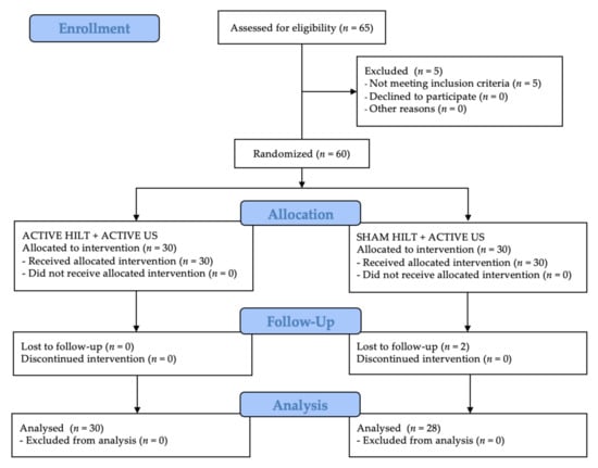 CONSORT flow chart of the study participants. Abbreviations: HILT, high-intensity laser therapy; US, ultrasound therapy.