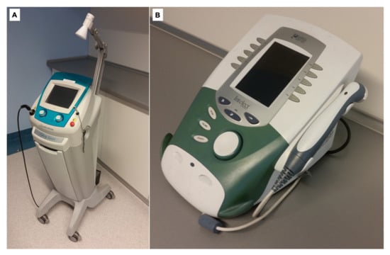 The patients were informed how they should prepare for the therapy, with a particular focus on how they should prepare their skin (clean and free of ointments, creams, and items that impede access to the treated region). In both cases (HILT and US), five treatments per week were performed for a period of three weeks (Monday to Friday), where treatment continuity was a prerequisite. The devices used in the present study for HILT and ultrasound therapies are presented in Figure 2.