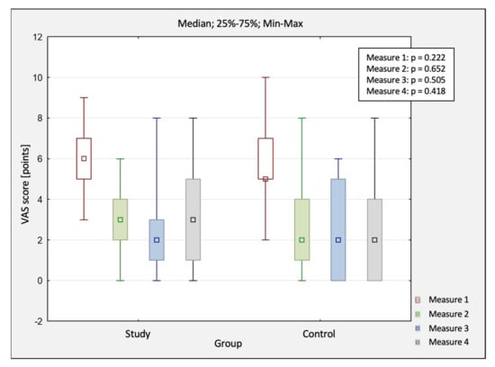 The comparison of changes in pain scores obtained in four measurements (M1—before treatment, M2—after treatment, M3—1 month after study completion, M4 – 3 months after study completion) between the study group and control group by using VAS are shown in Table 2. In both groups, the mean value of the pain score changed statistically significantly (main effect: p < 0.05). A statistically significant decrease in the study group was observed between M1 and M2 by 3.5 pts, between M1 and M3 by 3.7 pts, and between M1 and M4 by 3.2 pts. On the other hand, the control group showed a statistically significant decrease between M1 and M2 by 3 pts, between M1 and M3 by 3.4 pts, and between M1 and M4 by 3.2 pts.