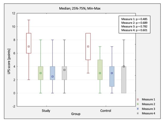 The comparison of pain between both groups was also conducted using LPS (Figure 4). No differences were observed between both groups at each treatment stage (p > 0.05). As before, there was no treatment advantage of HILT compared to the controls. Unfortunately, a slow recurrence of pain symptoms was observed in both groups in the follow-up conducted three months after completing the study. It should also be noted that there was a slight (not statistically significant) remission of pain complaints in the long-term assessment up to one month.