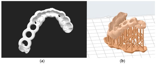 In the SLA 3D printer (Form 3, Formlabs Inc., Somerville, MA, USA), the drill guides were fabricated in a proprietary biocompatible photopolymer resin material (Dental SG Resin, Formlabs Inc., Somerville, MA, USA). The STL files of the drill guides were imported into the 3D printer’s slicing software (PreForm v. 3.4.4, Formlabs Inc., Somerville, MA, USA). Depending upon the complexity of the drill guides, the guides were oriented at a 30°ߝ45° angle generating sufficient raft and support structures (Figure 1). The manufacturer’s recommended settings for the respective biocompatible resin material were selected, and the guides were printed at a layer thickness of 50 microns. After printing, the drill guides were immersed and cleaned with 90% isopropyl alcohol (IPA) solution for 20 min and left to air dry for another 10 min. The drill guides were post-cured for another 30 min in an ultraviolet (UV-A light 385 nm) lightbox following the manufacturer’s instructions. Subsequently, the manual removal of the support structures from the drill guides was performed using fine-cutting pliers.