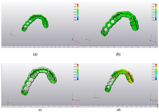 The digitized scans were imported into a medically certified CAD software (Materialise 3-Matic v. 14.0, Materialise, Leuven, Belgium) for accuracy and superimposed with the original planning data. For each drill guide, an n-point registration followed by a global registration was performed. The n-point registration was completed by selecting three manually placed control points on the original drill guide STL file and the corresponding 3D printed drill guide scan STL file. The selection of these points was performed for each drill guide depending on its respective individual design. Subsequently, the global registration was conducted, ensuring a more accurate match between the original STL file and the 3D printed drill guide scan STL file. Subsequently, the analysis module using the “create part comparison analysis” functionality in the software was used to evaluate the accuracy of the drill guides.