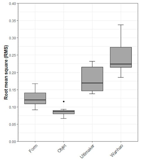 Box plot of the accuracy (trueness) of the root mean square (RMS) values (in mm) for each 3D printer.