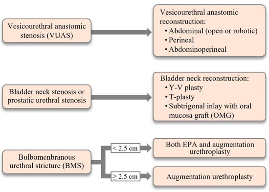 A. Bladder outlet obstruction (VUAS) after RP. If endoluminal treatment (persistently) fails or in case of a recalcitrant, totally obliterated posterior urethral stenosis, challenging lower urinary tract reconstruction may be considered in otherwise healthy men motivated to undergo surgery [80,81,92,93]. Open reconstruction will depend upon the length, location, caliber and etiology of the stenosis, continence status, bladder (dys)function, previous radiotherapy, patient’s preference, and surgeon’s expertise (Figure 3). In the authors’ opinion, these complex patients should be referred to high-volume centers specialized in complex urologic reconstruction. Before undertaking open reconstruction, placement of a suprapubic catheter initially can assist with a cystoscopic and imagiologic retrograde/antegrade evaluations (“up-and-down-gram”) that are essential for surgical planning. When possible, video urodynamics is a critical tool to assess bladder (dys)function. Several approaches have been described [66,94,95,96,97]. However, retropubic, transperineal and abdominoperineal, and more recently the robot-assisted, approaches for redo anastomosis are the most frequently employed. The downsides of the retropubic approach include difficult surgical access due to fibrotic obliteration of the Retzius space, compromised visualization, and eventually a short urethral stump. The advantage is the potential to preserve the rabdosphincter. A success rate of 60% with new onset UI of 30% was reported for the retropubic approach [97]. A success rate of 83% was described for the abdominoperineal approach. Noteworthy, all patients in this series received an AUS concomitantly [66]. The transperineal approach has been most widely used due to its lower invasiveness through a potential virgin area, and the possibility of mobilizing the urethra more extensively to bridge any gap created by resection of fibrotic tissue involved in the VUAS. Patency rates varied from 67% to 91% [4,98]. The major disadvantage is damage of the rabdosphincter, making implantation of an AUS universally required [4,98].