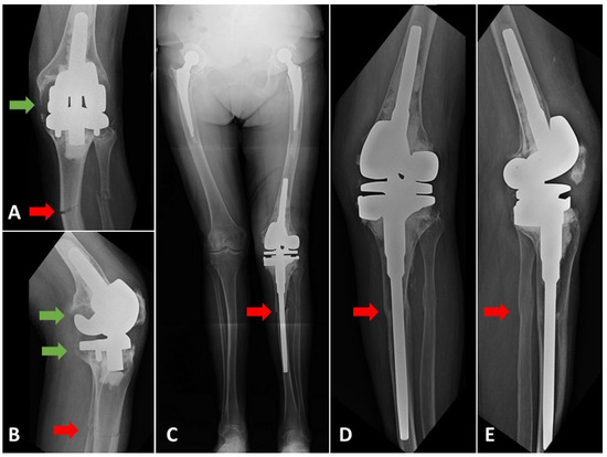 (A) AP and (B) lateral radiographs of a patient with the fracture of 1/3 proximal tibia and fibula shafts and loosened components of the knee prosthesis. (C) Postoperative, long-standing AP radiograph. Rotating-hinge revision knee prosthesis was used (MRH, Stryker, Mahwah, NJ, USA). (D) AP and (E) lateral radiographs of the same patient performed on the control visit 96 months after rTKA. Bone union was achieved. Green arrows indicate peri-implant bone osteolysis and loosening. Red arrows show the fracture level of the tibial shaft and bone union.