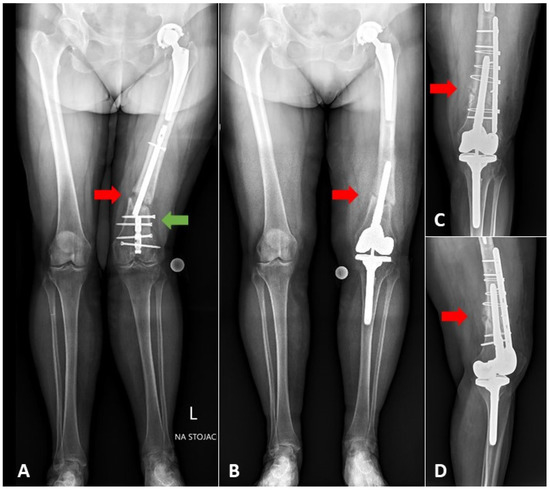(A) AP long-standing radiograph of the patient with the fracture of 1/3 distal part of the femoral shaft, with the broken retrograde femoral nail (green arrow), and knee osteoarthritis; (B) long-standing radiograph performed nine months after the one-stage TKA with long-stem extension. Bone union was not achieved due to insufficient stability of fracture causing excessively short (64 mm from the tip of stem to fracture level) and undersized stem (13 mm stem diameter filling 68% of medullary canal in the narrowest point). Shorter femoral stem was used due to the presence of hip prosthesis ipsilaterally. (C) AP and (D) lateral radiographs after re-stabilization with the additional plate fixation. Red arrows indicate fracture level.