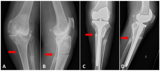 - Bauer, C.; Zaharia, B.; Galliot, F.; Parot, J.; Houfani, F.; Mayer, J.; Mainard, D. Management and results in periprosthetic tibial fracture after total knee arthroplasty: Two-center 15-case retrospective series at 2 years’ follow-up. Orthop. Traumatol. Surg. Res. 2020, 106, 449–458. [Google Scholar] [CrossRef]