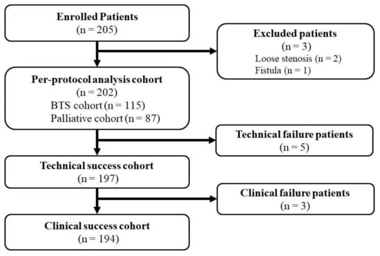 A flowchart of the patient registry is shown in Figure 1. The patients were enrolled from October 2013 to May 2014. Two hundred and five patients were enrolled in total. Three patients were then excluded because of loose stenosis identified on colonoscopy (n = 2) and fistula (n = 1). The per-protocol analysis (PPA) cohort comprised the remaining 202 patients. Treatment intent was a BTS in 115 (56.9%) patients and PAL in 87 (43.1%) patients. No patient dropped out during the 7-day follow-up period.