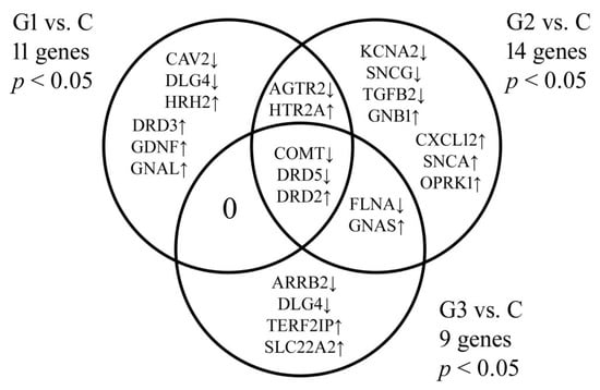 A one-way ANOVA with Benjamini–Hochberg correction showed that among 175 dopamine-related mRNAs, the expression of 38 mRNAs representing 24 genes was significantly changed in endometrial cancer compared to control. Tukey’s post hoc test and a Venn diagram revealed genes characteristic of a given cancer grade or common to several groups (Figure 1).