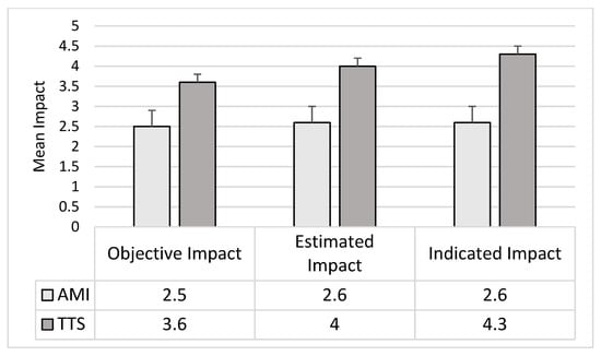 The ANOVAs for the Trigger Event Impacts showed significant differences between the two groups in the levels of Objective Impact (F1,45 = 7.60; p = 0.01), Interviewer-estimated Impact (F1,45 = 11.78; p = 0.001; pη2 = 0.21), and Subject-indicated Impact (F1,45 = 17.79; p = 0.0001). The TTS group reported a higher score than the AMI group in all types of impact (Figure 2).