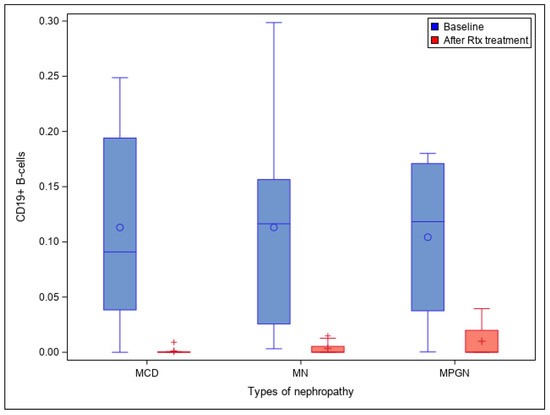 CD19+ B cell values before and after rituximab (RTX) for each of the three main types of nephropathy (MN, MCD, and MPGN). MN: membranous nephropathy. MPGN: membranoproliferative glomerulonephritis. MCD: minimal change disease. Rtx: rituximab.