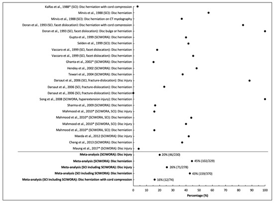 Frequency of disc injury or herniation on MRI in patients with acute spinal cord injury. * Studies that include pediatric patients (<16) or unspecified age range.