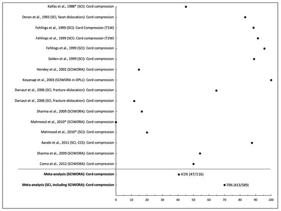 Frequency of cord compression on MRI in patients with acute spinal cord injury. * Studies that include pediatric patients (<16) or unspecified age range.