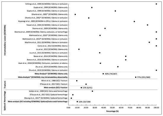 Frequency of Epidural Hemorrhage, Fracture, and Intramedullary Lesions (SCIWORA) on MRI in patients with acute spinal cord injury. * Studies that include pediatric patients (<16) or unspecified age range.