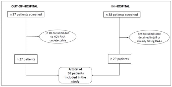 We carried out a retrospective observational study including patients with HCV chronic infection (i.e., with documented detectable HCV RNA), considered eligible for DAAs treatment, who were active or past intravenous drug users and/or who were experiencing homelessness. In order to test our hypothesis that an out-of-hospital setting might ensure a greater retention in care in difficult-to-treat populations, we compared our outcomes between patients with similar characteristics but treated for HCV in different circumstances (i.e., out-of-hospital and in-hospital services).