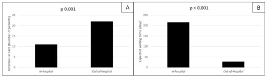 Patients treated with DAAs in our population. Retention in care rates among patients treated for HCV in hospital and out of hospital Panel (A); expected days of waiting before DAAs treatment start in the standard in-hospital setting group and in the out-of-hospital setting group panel (B).
