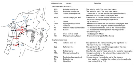 - Savoldi, F.; Xinyue, G.; McGrath, C.P.; Yang, Y.; Chow, S.C.; Tsoi, J.K.H.; Gu, M. Reliability of lateral cephalometric radiographs in the assessment of the upper airway in children: A retrospective study. Angle Orthod. 2020, 90, 47–55. [Google Scholar] [CrossRef] [PubMed] [Green Version]