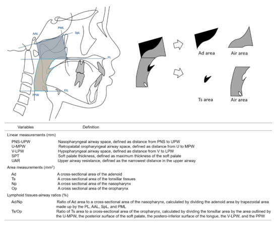 Several studies have shown that enlarged Ad and Ts influence the general growth and development of the body in direct and indirect aspects [1,4]. Overgrown Ad and Ts lead to a developmental disease in the craniofacial region by obstructing the upper airway, including obstructive sleep apnea syndrome (OSAS). OSAS is an important cause of morbidity in both children and adults. Childhood OSAS differs significantly from that of adults in terms of various parameters such as their symptoms, pathogenesis, diagnosis, treatment, and outcome. The estimated prevalence of childhood OSAS ranges from 3 to 10% [5,6]. However, the relationship between the airway and lymphoid tissue morphology (Ad and Ts) and physique (height and weight) in growing children remains unclear.