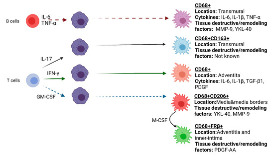 Recent findings regarding IL-6-producing B cells in GCA indicate a potential role of B cells in GCA pathogenesis. B cells have been described in the adventitia and media of GCA temporal artery and aorta, mostly colocalized with infiltrated CD3+ T cells [64]. Such lymphoid aggregates that show compartmentalization of T and B cells were defined as artery tertiary lymphoid organs (ATLOs) [65,66]. Investigation of ATLOs in GCA demonstrated an association with the ectopic expression of CXCL13 and B-cell activating factor (BAFF) which were shown to increase following in vitro stimulation of temporal arteries with IL-6 [66]. In vitro investigation on the interaction between B cells from GCA and macrophages revealed that soluble factors secreted by B cells enhanced pro-inflammatory cytokine production (IL-6, IL-1β andTNF-α) and induced higher expression of tissue-destructive factors (MMP-9, YKL-40) in macrophages [67]. Furthermore, GM-CSF producing B-cells that can efficiently activate myeloid cells were identified in multiple sclerosis, another autoimmune disease [68,69]. This suggests an interesting interaction between B-cells and macrophages, a notion that requires additional investigation in GCA. Overall, in GCA, different cell types and microenvironments direct functional and phenotypical diversity of macrophages (Figure 2). Novel high dimensional proteomic and transcriptomic methods such as GeoMXTM (Nanostring) and Visium Spatial gene expression platform (10× Genomics) may aid in identifying the macrophage phenotypes in GCA lesions in more detail and provide better insight on macrophage heterogeneity and their specific functions in the vasculopathy of GCA.