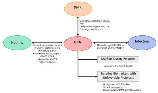 Figure 3. Serum markers in GCA. Several markers are altered in GCA compared to healthy controls. Some studies reported markers to differentiate GCA patients from patients with isolated polymyalgia rheumatica (PMR). There is currently no macrophage markers to discriminate between GCA and infection (e.g., respiratory and urinary infection) [51,104,105,106,107,108,109,110,111,112].