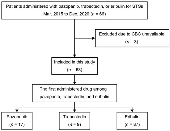 In total, 63 patients were included in this study whereas three patients were excluded because their complete blood counts were not available (Figure 1). The median age was 66 years, and the median follow-up was 510 days. Eribulin was the first drug administered to 37 patients, pazopanib was the first for 17 patients, and trabectedin was the first for nine patients. Some overlapping in the administration of eribulin, pazopanib, and trabectedin were observed (Table S1). There were no statistical associations between the drugs first administered and demographic variables such as age and the number of previous chemotherapies, except for histology. L–sarcoma was identified for 64.9% of patients first given eribulin, 17.7% for patients first given pazopanib, and 66.7% for patients first given trabectedin (p = 0.0036) (Table 1, Table S2).