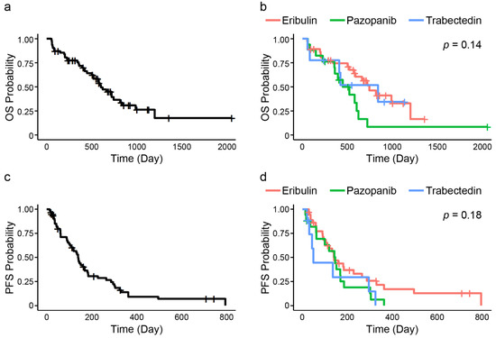 Figure 2. OS and PFS for advanced STSs patients. (a) OS for all STSs patients; (b) Comparison of OS among the first administered drugs. There were no differences among the first administered drugs; (c) PFS for all STSs patients; (d) Comparison of PFS among the first administered drugs. There were no differences among the first administered drugs.