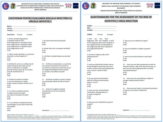 All included individuals were tested for the presence of anti-HCV antibodies. The antibody test used for the screening was Anti-HCV TEST WB/S/P (INFO in vitro diagnostic test, Türklab Tibbi Malzemeler San. ve TİC. A.Ş., İzmir, Turkey). With stated 100% specificity and sensitivity (https://www.turklab.com.tr/anti-hcv-test, accessed on 31 August 2021), these qualitative in vitro tests are also single use and disposable. The kits were stored at room temperature and capillary blood samples were taken according to the manufacturer’s guidance by using a sterile, disposable lancet. A result was visible within 5–15 min. This result would be conclusive if a test line appeared next to the control line (which stands for the accuracy of the test), indicating that the test was positive. All these tests and questionnaires were provided by the Association for the Promotion of Youth in Craiova (APT-C).