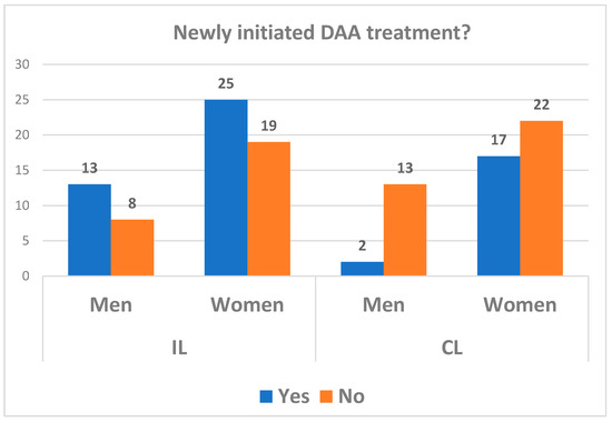 The overall presence of anti-HCV-antibodies was 0.77% for the entire lot (119 cases, 54 in the CL and 65 in the IL). Of these, DAA treatment could be initiated in 57 cases (47.8% of the subgroup). A detailed view of these aspects can be found in Figure 3.