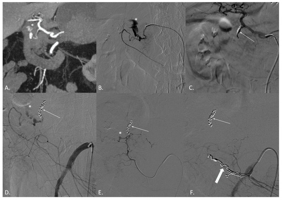 (A–F) CT angiography (CTA) and digital subtraction angiography (DSA) of a 74-year-old male patient suffering from active bleeding of a duodenal peptic ulcer successfully treated with coil embolization both from the celiac trunk and the superior mesenteric artery (SMA)—“sandwich technique”. (A) CTA demonstrates active endoluminal bleeding (*) from the gastroduodenal artery (GDA). (B) DSA obtained with catheterization of the GDA confirms CTA findings. (C) DSA obtained with catheterization of the celiac trunk after coils and gelfoam embolization of the GDA (thin arrow). (D) DSA obtained with catheterization of the SMA demonstrating residual active bleeding (*) from the inferior pancreaticoduodenal arteries (iPDA). (E) DSA obtained with catheterization of the iPDA confirms the active bleeding (*). (F) DSA obtained with catheterization of the SMA after coil embolization of the iPDA (thick arrow). No active bleeding evidence.