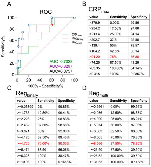 ROC analysis of a single value and two formulas for the prediction of an infection. (A) The ROC analysis shows the different performance of three infection prediction models. (B) The single parameter “CRP max” is able to predict an infection with a sensitivity of 75% and a specificity of 56.86%, if the cut-off is set above 91.20 mg/L (AUC: 0.7028). (C) A binary logistic regression with a cut-off above −4.725 leads to a sensitivity and specificity of 75% and 80.03%, respectively (AUC: 0.8297). (D) A multinominal logistic regression consisting of the five most important parameters leads to the development of an equation with the ability to predict an infectious complication with a sensitivity of 87.5% and an accompanying specificity of 78.85%, if the cut-off is set to >−8.566 (AUC: 0.8757). The mentioned “best” values are marked in red.