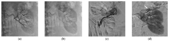 - Loffroy, R.; Abualsaud, B.; Delgal, A.; Guiu, B.; Kermarrec, I.; Michel, F.; Cormier, L.; Mousson, C.; Majbri, N.; Rebibou, J.M.; et al. Role of percutaneous arterial embolization in renal pathology. Prog. Urol. 2010, 20, 161–171. [Google Scholar] [CrossRef]