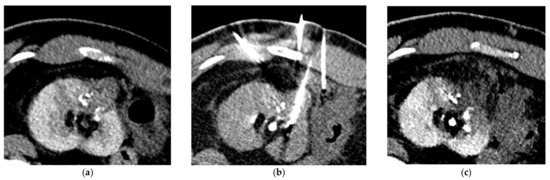 - Arima, K.; Yamakado, K.; Kinbara, H.; Nakatsuka, A.; Takeda, K.; Sugimura, Y. Percutaneous Radiofrequency Ablation with Transarterial Embolization is useful for treatment of Stage 1 renal cell carcinoma with surgical risk: Results at 2-year mean follow up. Int. J. Urol. 2007, 14, 585–590, discussion 590. [Google Scholar] [CrossRef]