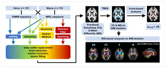 To test whether differences in scanners (Verio vs. Skyra), sequences (MPIL vs. CMRR) or preprocessing tools (unfiltered vs. denoised vs. Siemens low-pass window filtering vs. unringing by Kellner method) affect DTI-derived outcome measures, we analysed whole-brain voxel-wise and ROI-based mean FA and MD values within the white matter skeleton (see Figure 1).