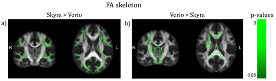 More detailed limitations include that we did not correct for gradient non-linearities which could similarly affect diffusion tensor metrics as the apparent diffusion coefficient as shown by Fedeli et al. [69] and Tan et al. [71] and thereby account for some of the differences we found on the mean FA and MD skeletons. However, the small non-linearity in the gradients of the used clinical MR systems, the relatively small field-of-view (only the brain) and the comparably low b-value (b = 1000 s/mm²) minimize the effect of gradient non-linearity on image distortions and b-value variation compared to other studies where such corrections are needed (e.g., Human Connectome Project [17]. To further control for a correct application of the diffusion gradients, the positioning of the participants followed a standardised protocol to position the brain in the isocentre of the gradient coil which presents the smallest non-liberalities. Additionally, in a parallel comparison of the anatomical images from Verio and Skyra, gradient non-linearity correction—conducted with the gradunwarp implementation [https://github.com/Washington-University/gradunwarp (accessed on 5 October 2021)] in Python 2.7.)—did not substantially reduce the detected differences [65]. This is why we estimate that gradient non-linearities might only explain a small share of the differences in the WM skeletons between the scanners. Nevertheless, we did not check and correct for gradient non-linearities in this study, and therefore cannot exclude small residual effects.