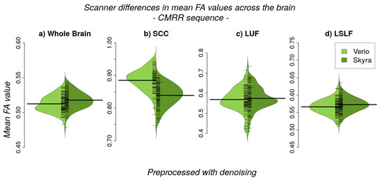 We aimed to systematically determine the effects of different scanner versions and preprocessing pipelines on DTI-derived outcomes using a large sample size. Specifically, we compared a Siemens 3T Magnetom Verio with its upgraded version Siemens 3T Magnetom Skyra and evaluated the “Kellner Method” (a Gibbs ringing artefact removal tool) [48] in comparison to the standard low-pass window filtering technique available on the Siemens scanner, noise reduction (MRtrix3.0) [6,56] and a pipeline without correction. We chose a within-subject design, short time gap between scans, high number of subjects and matched scanning protocols at both imaging sites—scanning protocols are publicly available at https://osf.io/vnuqp/ (accessed on 5 July 2021). The main research questions of the current study comprise: