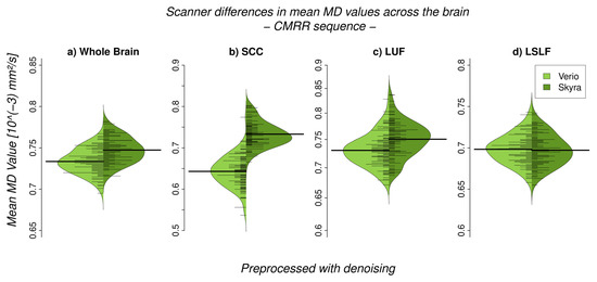 We observed a significant difference between 3T Verio and Skyra scanners after preprocessing with denoising in whole brain white matter skeleton mean FA values (Figure 2 and Figure 3; CMRR sequence; Bayesian linear modelling, n = 115: BF[mean FA value ~ scanner] = 33.9) with a CoV of about 7.1%; this means that the alternative hypothesis H1 is 33 times more likely than the null hypothesis. On the whole brain level, Skyra delivered slightly higher mean FA values (see Table 1). However, scanner differences in mean FA value were not consistent across white matter tracts (Figure 2, Table 1). Central fibre tracts with high FA values such as the splenium of the corpus callosum (SCC) delivered significant differences between the mean FA values of the two scanners (Bayesian linear modelling, n = 115: BF[mean FA value ~ scanner] = 1.1 × 1032, CoV 30.7%) with Verio showing much higher values. More lateral such as the left uncinate fascicle (LUF) did not show significant differences between scanners (BF = 1.1) but a CoV of about 31.5%. However, in fibre tracts with mean FA values of the same scale () but of a longer range such as the left superior longitudinal fascicle (LSLF), scanner differences were significant (BF = 3.3 × 1012) with Skyra showing higher values and a CoV around 11.1%. Differences of the mean FA values in percentages : whole brain: ~1%, SCC: ~−5.2%, LUF: ~1%, LSLF: ~1.1%. In addition to the analysis of scanner differences in the FA skeleton for the different brain regions, we also tested for scanner differences in MD values (Figure 4 and Figure 5). With TBSS, we found a clear whole brain difference with Skyra showing higher MD values than Verio (Figure 4; CMRR sequence; preprocessed with denoising). This clear direction of the scanner difference is supported by the whole brain mean MD value comparison with Bayesian linear modelling (Figure 5, Table 2; n = 115: BF[mean MD value ~ scanner] = 1.4 × 108) with a CoV of about 11.1%. Central fibre tracts such as the splenium of the corpus callosum (SCC) and lateral fibre tracts such as the left uncinate fascicle (LUF) exhibit the same pattern (Skyra showing higher MD values than Verio) with differences in magnitude (SCC: BF[mean MD value ~ scanner] = 1.3 × 1050, CoV = 27.4%; LUF: BF[mean MD value ~ scanner] = 1.4 × 104, CoV = 28.3%). Only in longer fibre tracts comprising many different and crossing fibre orientations, scanner differences are not evident (BF[mean MD value ~ scanner] = 0.16, CoV = 13.9%). Differences of the mean MD values in percentages : whole brain ~2%, SCC: ~14%, LUF: ~3%, LSLF:~−0.2%.
