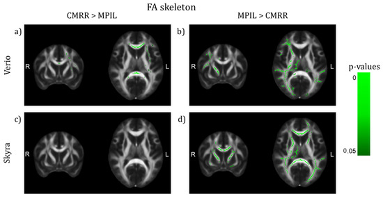 TBSS of differences on the FA skeleton between sequences after preprocessing with denoising (TFCE corrected, highlighted white matter areas: p < 0.05, (y,z) = (9,10)). (a,b) Verio: CMRR shows higher FA values in central brain areas, mainly in the CC, whereas MPIL shows higher FA values in lateral areas in the right hemisphere. (c,d) Skyra: MPIL delivers higher FA values in both hemispheres.