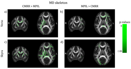 Investigating the effect of different imaging sequences run at the same scanner (with harmonised protocol parameters, MPIL vs. CMRR, Verio n = 23, Skyra n = 28), TBSS (TFCE and motion corrected, p < 0.05) detected that regional mean FA values differed significantly in several WM tracts dependent on scanner. Sequence differences were more pronounced in FA maps from Verio: CMRR showed higher FA values in central brain-areas, mainly in the CC, whereas MPIL showed higher FA values in cortical tracts in the left hemisphere (Figure 6a,b)). Data from Skyra though showed no WM tracts in which CMRR delivered higher FA values than MPIL but MPIL indicated higher FA values in both hemispheres, cortically and sub-cortically (Figure 6c,d)). Regarding the comparison of the sequences based on MD maps, patterns were less pronounced: the CMRR sequence appeared to deliver higher MD values in both hemispheres cortically and sub-cortically (Figure 7a,c)) whereas the MPIL sequence shows higher MD values cortically and rather frontally and in the left hemisphere at Verio (Figure 7b)) but more occipitally and in the right hemisphere at Skyra (Figure 7d)).