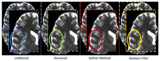 The qualitative visual data control of the MPIL sequence (Skyra) revealed that the GR artefact appeared very strong in the unfiltered b0 (T2-weighted) images. After preprocessing, different levels of GR reduction were visually detected (Figure 8). Specifically, while denoising did not reduce GR artefacts, the unringing tool by Kellner et al. [48] seemed to clearly reduce the GR artefact. The low-pass window filtering by Siemens introduced a global blurring but the oscillations starting from the bright cortico-spinal-fluid (CSF) surrounding the brain were still visible.