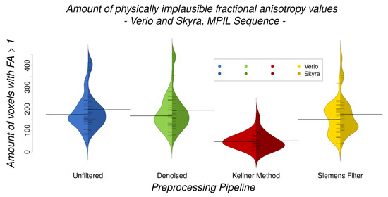 In line with visual assessment, quantitative analyses indicated that different preprocessing pipelines (Skyra, MPIL sequence) differ significantly in their efficiency of reducing the amount of implausibly high FA values (Bayesian linear modelling: BF[#(voxels with FA > 1) ~ preprocessing pipeline] > 4.7 × 1010). The unringing tool reduced the amount of implausible FA values significantly (paired Bayesian t-test: BF[unfiltered ~ Kellner Method] > 8 × 109, CoV = 42.3%) whereas the quantity of implausible FA values did not change consistently after any other preprocessing tool (BF[unfiltered ~ denoising] = 0.7, CoV = 104.7%), BF[unfiltered ~ Siemens low-pass window filtering] = 13, CoV = 78.1%) (Figure 9). Further, there were no significant differences in the amount of physically implausible FA values between Verio and Skyra (Bayesian linear modelling, full/null model comparison: = 0.05 ± 1.09%).