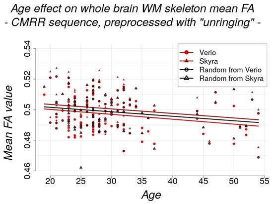 Negative effect of age on whole brain WM skeleton for both scanners separately (red circles: Verio, dark red triangles: Skyra, black framed circles and triangles: randomly selected to simulate pooled dataset from two different scanners). The effect modelled with linear modelling (mean FA value ~ age) is comparable between scanners (estimate ± std. error: Verio: Verio: −3.203 × 10−4 ± 1.237 × 10−4 and Skyra: −2.957 × 10−4 ± 1.347 × 10−4, random scanner: −2.925 × 10−4 ± 1.265 × 10−4). Bayesian linear modelling delivered significant results for the negative age effect: = 5.49 ± 1.39%. In the case of studies conducted on different scanners (simulated by randomly selected subjects from Skyra and Verio, black line), the age effect size was still present and of intermediate magnitude.