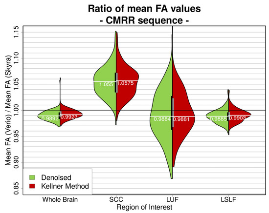As suggested by Pohl et al. [40], we calculated a whole brain correction factor in order to potentially harmonise the data and obtained = cf = 0.9892 (after denoising), which was comparable between preprocessing pipelines (Bayesian linear modelling, n = 115: BF[mean FA ratio ~ preprocessing pipeline] = 0.6; Figure 11). Calculations of the correction factors for the selected ROIs (SCC, LSLF, LUF) however yielded correction factors which differed significantly (after denoising/after unringing with Kellner Method) depending on ROI: SCC = 1.055/1.0575, LSLF = 0.9885/0.9903, LUF = 0.9884/0.9881 (Bayesian linear modelling, n = 115: >> 2 × 10196 ± 1.15%.; Figure 11). The different levels of preprocessing did not play a major role here (Bayesian linear modelling, n = 115: < 7 × 10−6 ± 1.52%).