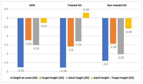 Cochrane’s review established that children with ISS underwent an increase in their final height of 3.7–7.5 cm, but nevertheless, they reached a shorter than average final height [23]. On the contrary, in a meta-analysis of 21 studies, Paltoglou et al. showed that treatment with GH improves short-term linear growth and increases adult height as compared to control subjects without treatment [26]; in our study, the observed adult height was similar to the parental and normal population heights. This supports the hypothesis that different responses occur depending on the type of treatment received.