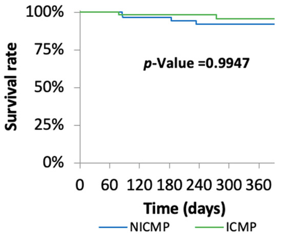 At one-year follow-up, ventricular tachyarrhythmias including ventricular fibrillation (VF), non-sustained ventricular tachycardia (nsVT), and ventricular tachycardia (VT) were lower in the NICMP group compared with the ICMP group (17.24% vs. 38.71%; p = 0.07) (Table 2). However, the long-term mortality rate was similar in both groups (Figure 2).