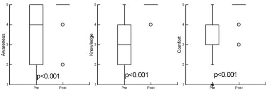 Supplementary File S1). Surveys were administered on paper and completed by the caregiver in a private setting. Answers were collected using a 5-point Likert scale with “1” being none/not at all aware/knowledgeable/comfortable and “5” being very aware/knowledgeable/comfortable. Education and materials were provided in English, and an interpreter was used for caregivers who were non-English speaking.