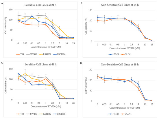 The results of the cell viability assays after 24 and 48 h of exposure to FTY720 are illustrated as line graphs in Figure 2, where the percentage cell viability is expressed as a percentage of the vehicle control across the concentrations of FTY720. LS411N, T84, HCT116, and SW480 were sensitive to FTY720, whereas DLD-1 and HT-29 were non-sensitive. The percentage of viable cells of the vehicle control of each cell line was never under 85% of the untreated cells’ viability, thus ruling out any interference by the vehicle.